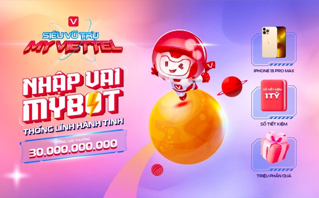 Khi tham gia chương trình “Siêu vũ trụ My Viettel” trên ứng dụng, quý khách hàng sẽ có cơ hội nhận được vô vàn giải thưởng hấp dẫn với tổng giá trị 30 tỷ đồng cho 30 triệu giải thưởng. Giải thưởng sẽ bao gồm các sản phẩm dịch vụ viễn thông như Data, phút thoại, thẻ cào, các voucher mua sắm & mã bốc thăm trúng thưởng giải may mắn như sổ tiết kiệm 1 tỷ và 20 iPhone 13 Promax.